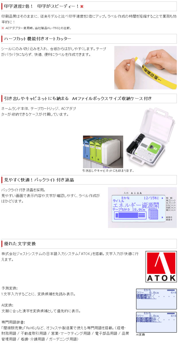 | 付属品 | ACアダプター、電源コード、テープカートリッジ(18ミリ幅1本)、専用収納ケース |