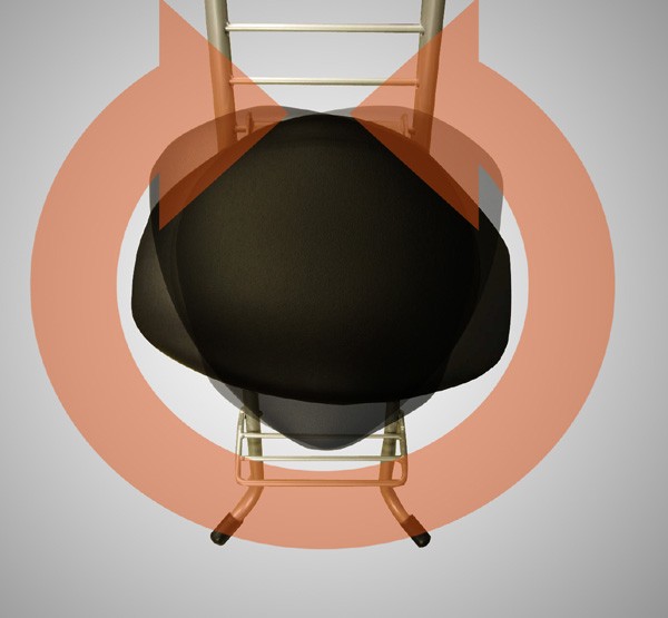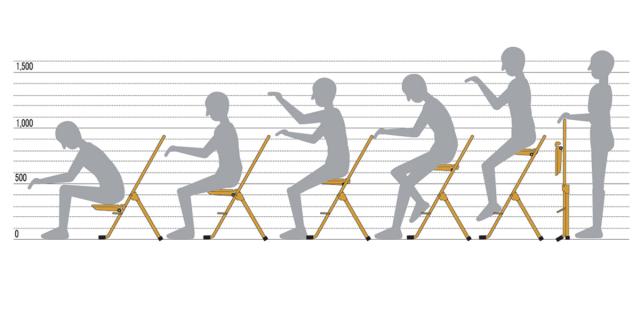 「工場家具」という新しいコンセプトに基づき開発されました。椅子に腰掛けたままの姿勢で長時間過ごす機会が多い環境で問題になる腰痛、肩こり、近視などの病気。原因は背骨や骨盤に負担をかける不自然な作業姿勢にあります。プロワークチェアは、この不自然な着座姿勢の発生を独自の座面高さ調整機能により根本から解消します。低く屈んだ姿勢から立ち仕事まで、作業に合わせて座面高さが12段階に調整できます。脚フレームの横棒に座部を引っかけて固定すると、簡単に座面高さを変えられます。