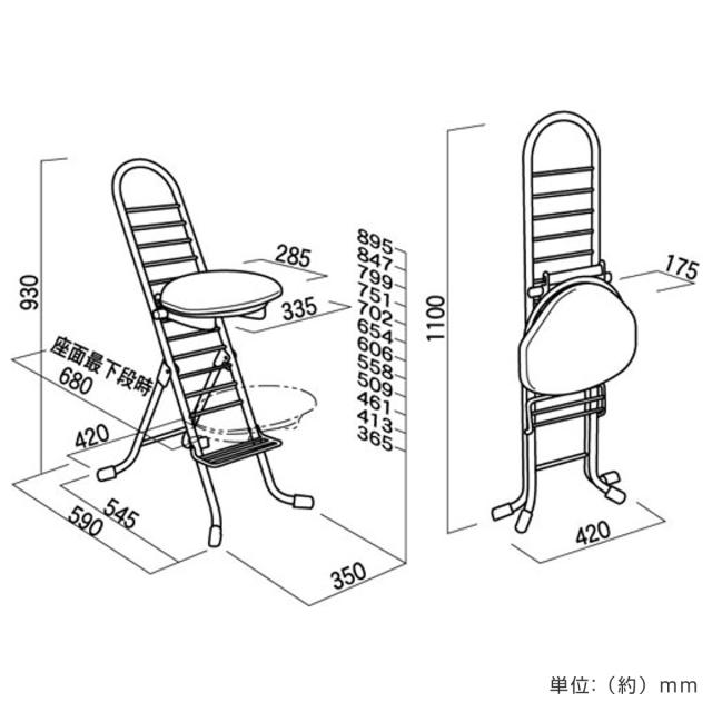 | サイズ | 約 幅42×奥行59×高さ93(cm) 座面高さ:約36.5〜89.5(cm) 折りたたみ時:約 幅42×奥行17.5×高さ110(cm) |