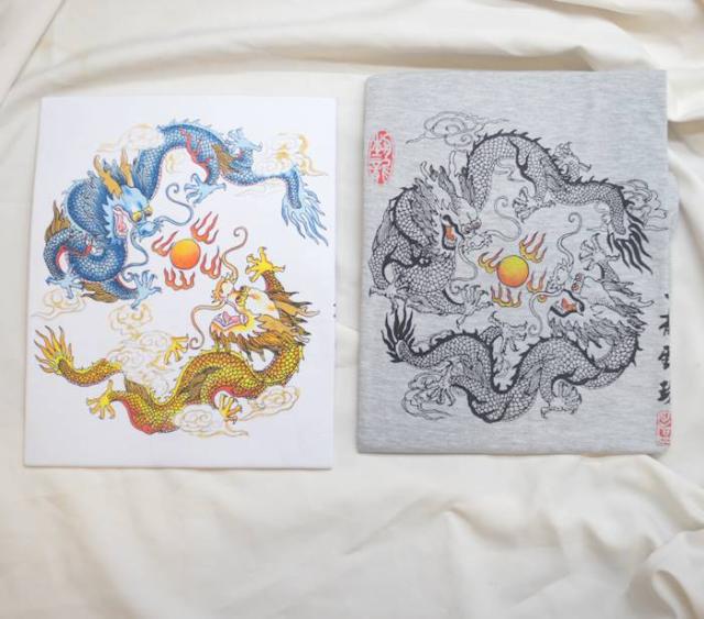 本商品は胸に【双龍】がプリントされたティーシャツです。2頭の天子の龍が龍珠を取り合う中国ではポピュラーな吉祥のモチーフ【双龍龍珠】の絵柄です。