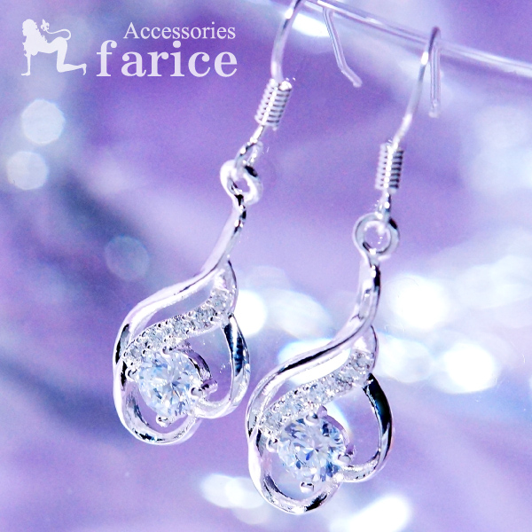 ラウンドカットクリアキュービックジルコニア カールフレームダブルハート ラインストーン装飾 レディース アメリカンフック ピアス