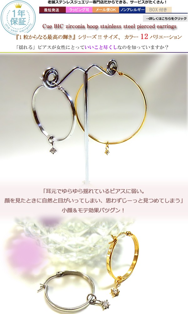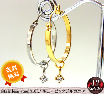 送料無料 1粒ジルコニアフープピアス レディース ステンレスピアス イエローゴールド/