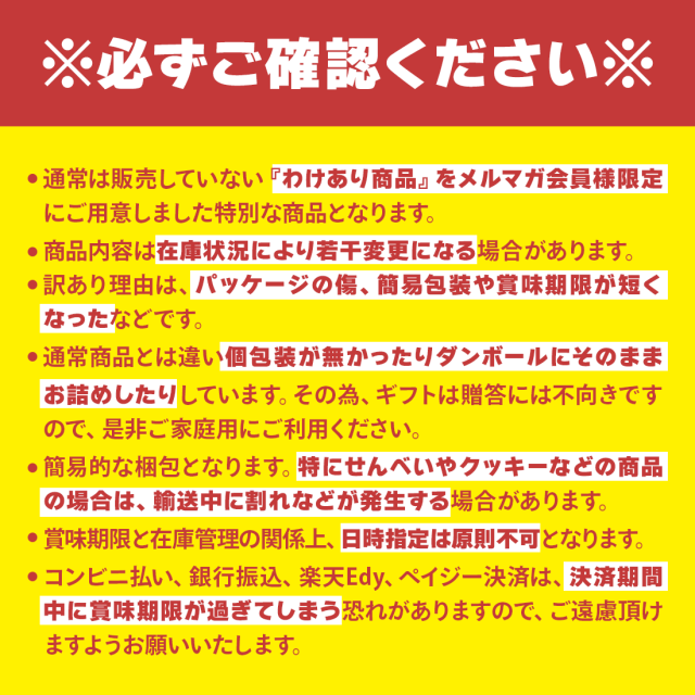 - ■簡易的な梱包となります。特にせんべいなどの商品の場合は、輸送中に割れなどが発生する場合があります。