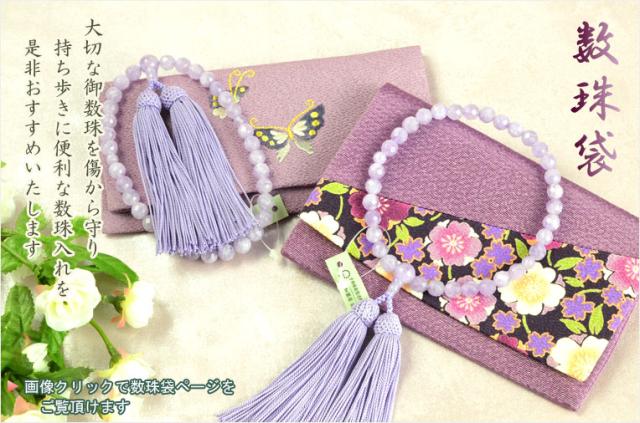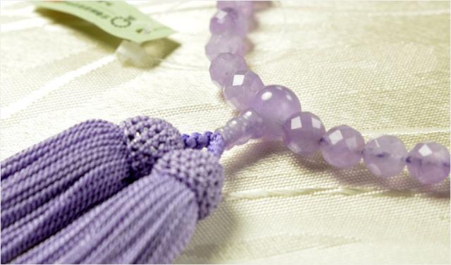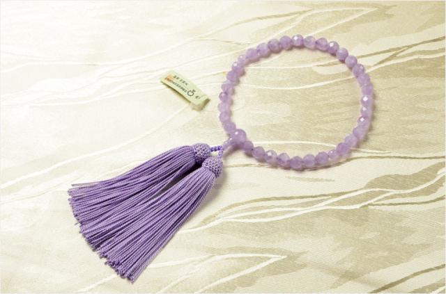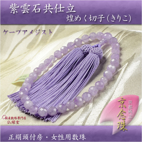 国産京都の数珠・念珠【京念珠:紫雲石切子 共仕立】女性用数珠・正絹頭付房 ケープアメジスト 化粧箱付でネコポス送料無料