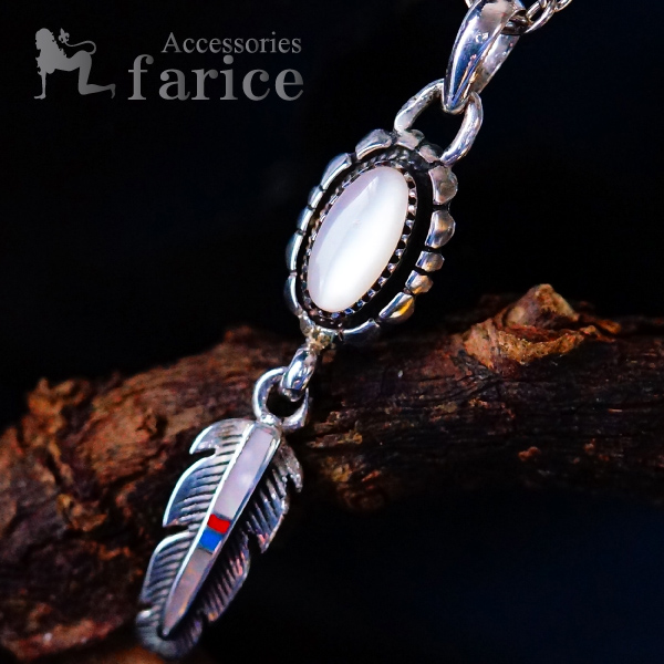 ★商品のサイズ★ (バチカンを含む)全長約55mm/重さ約4.5g/フェザーパーツ縦約20mm×横幅約8mm 【石/ホワイトシェル】12mm×7mm×3mm 【あずきチェーン】長さ約45cm/幅約2.5mm★素材★ シルバー925+ホワイトシェル/レッドコーラル(珊瑚)/ターコイズ★商品のコメント★ 見た目にも際立つ色彩の美しさで多くの人を魅了するホワイトシェルをメインにこちらも人気定番のフェザー(羽)を組み合わせ、ターコイズ&レッドコーラル(珊瑚)の多彩な装飾を使って高級感タップリに仕上げたインディアンジュエリーシルバー925ペンダントネックレスです。メインとなるのはホワイトシェルでオーバルカボションカット(楕円形ドーム型)の仕上がりが艶やかな光沢感とムーンストーンを連想させる神秘的で美しい色彩を最大限に引き出しています。もちろんただ着けているだけでも胸元から放つ高級感溢れる華やかな存在感は抜群過ぎる程!石留め&ブロック型装飾のゴツゴツとした形状がオーバルカボションの滑らかで美しいシルエットを一層際立たせています。ホワイトシェルに組み合わされたフェザーはヘッド上部に合わせたギザギザ感のあるフォルムが特徴で、デザインに厚みを持たせた装飾のとても良いア...