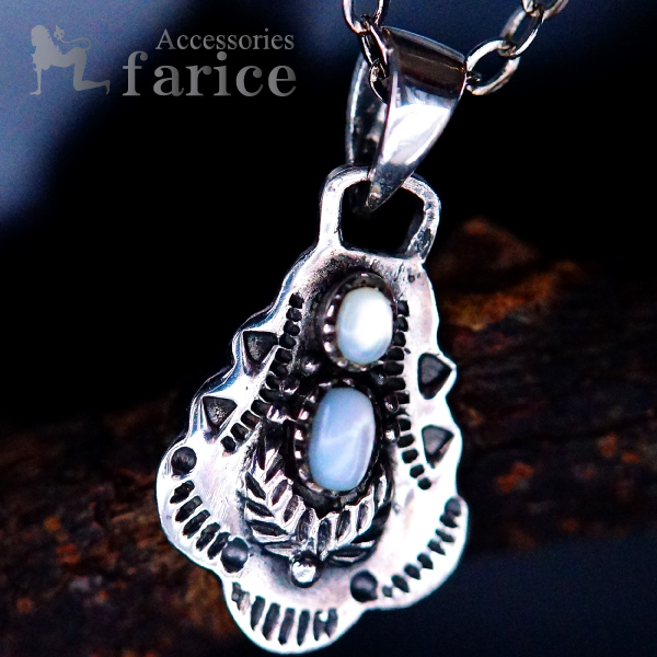 2ホワイトシェル装飾&2フェザー(羽)彫り メンズ&レディース インディアンジュエリー シルバー925 ペンダント ネックレス