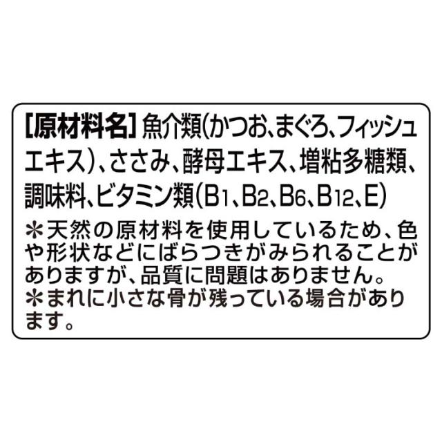 | 魚介類(かつお、まぐろ、フィッシュエキス)、ささみ、酵母エキス、増粘多糖類、調味料、ビタミン類(B1、B2、B6、B12、E)*天然の原材料を使用しているため、色や形状などにばらつきがみられることがありますが、品質に問題はありません。*まれに小さな骨が残っている場合があります。 |