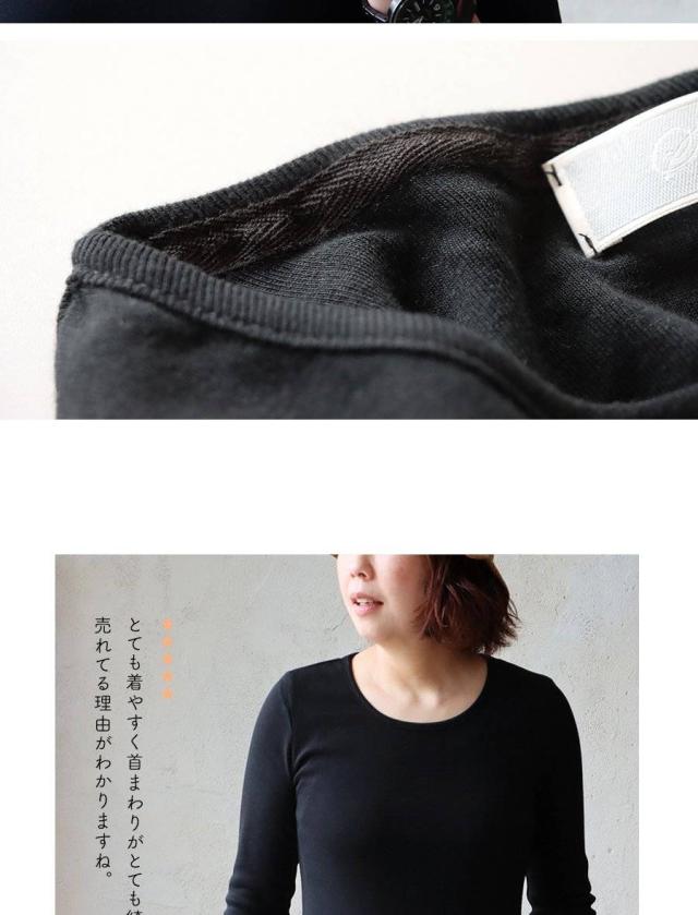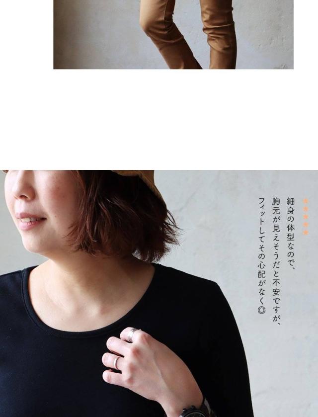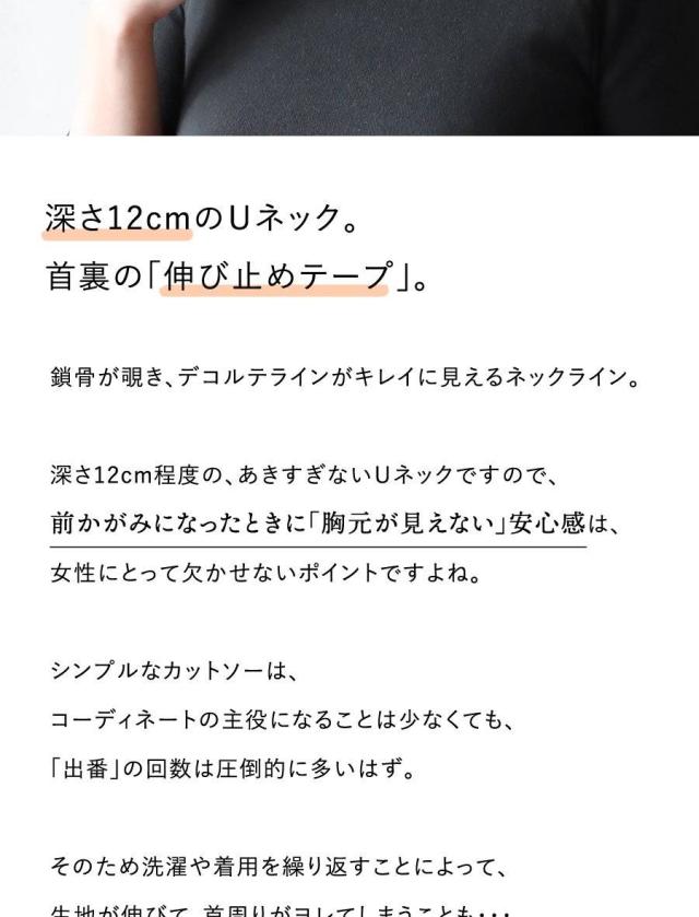 ・「胸元が見えない」安心の深さ12cmのUネック×首裏の「伸び止めテープ」。