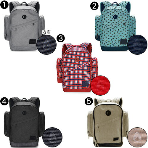 NIXON!サイドのマチ付きポケットがデザインのアクセントに★≪送料無料≫商品:TAMARACK/リュックサック デイパック タマラックカラー:1.ヘザーグレー,2.シ-フォーム,3.レッドxネイビー,4.ブラックxブラックウォッシュ,5.カーキxヘザーサイズ(約):横45×縦44×マチ14cm【ベルト】〜97cm素材:メインボディ:600Dポリエステルライナー:210Dナイロンボトム:600Dポリエステル重さ(約):515g/18L備考:【メイン開閉】ダブルファスナー外側/ファスナーポケット×4内側/ファスナーポケット×1オープンポケット×5ペン挿し×3