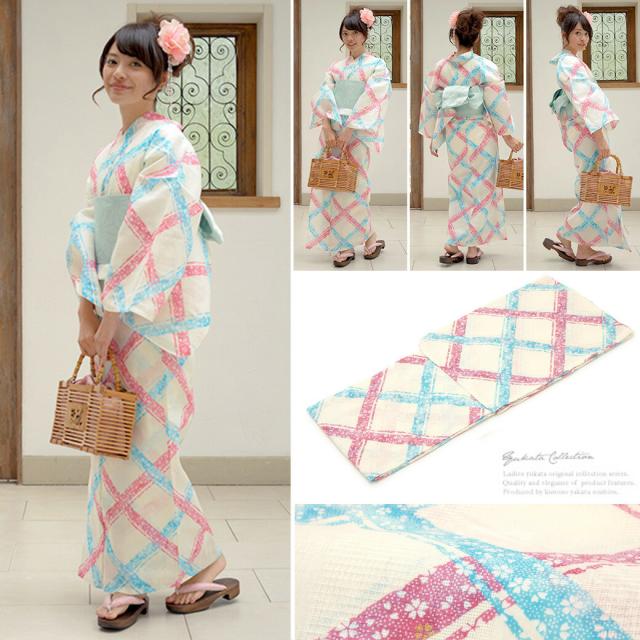 浴衣セット レディース レトロ 浴衣セット 大人 3点セット クリーム 黄色系 水色 ピンク 斜め格子 桜 ラメ 綿 半幅帯 女性 ボヌールセゾン