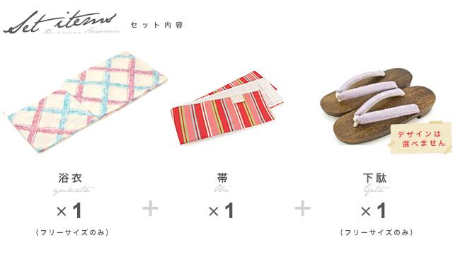 こちらの商品は、浴衣・帯・下駄の3点セットです。セット内容の一部変更や、それに伴う値引きは承っておりません。