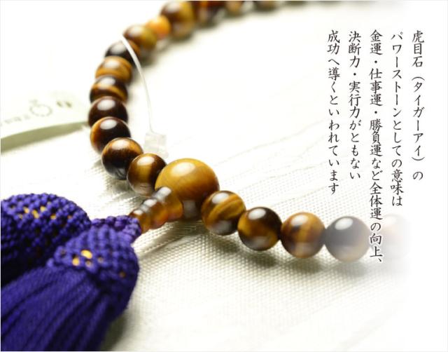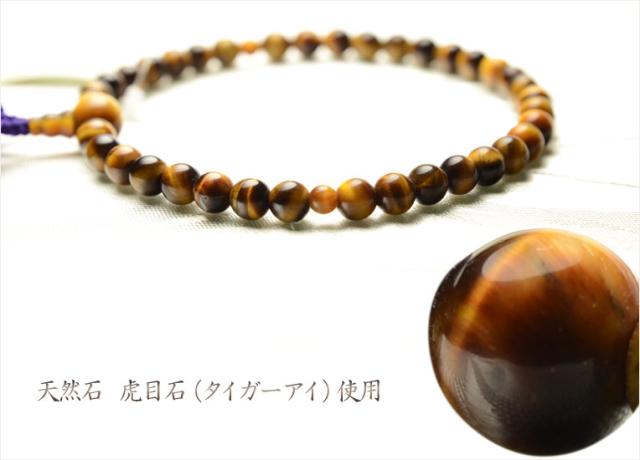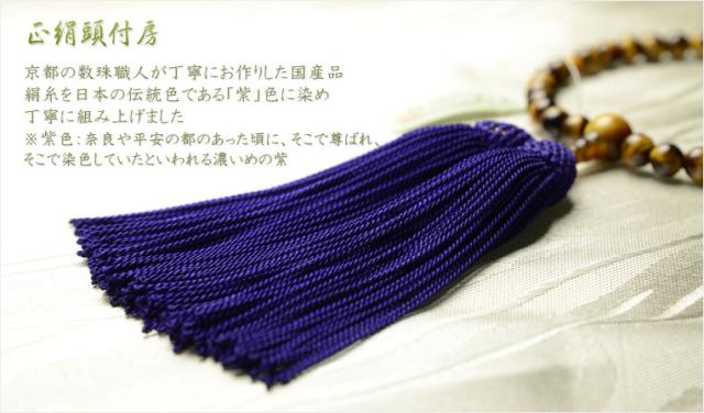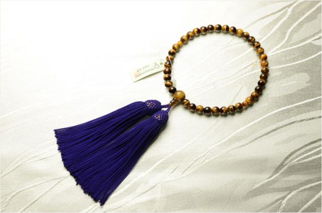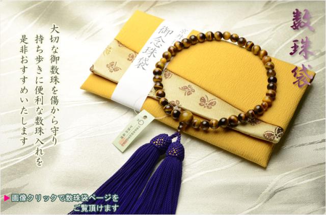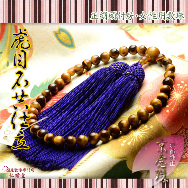 国産京都の数珠・念珠【京念珠:虎目石共仕立】女性用数珠・正絹頭付房 化粧箱付でネコポス送料無料