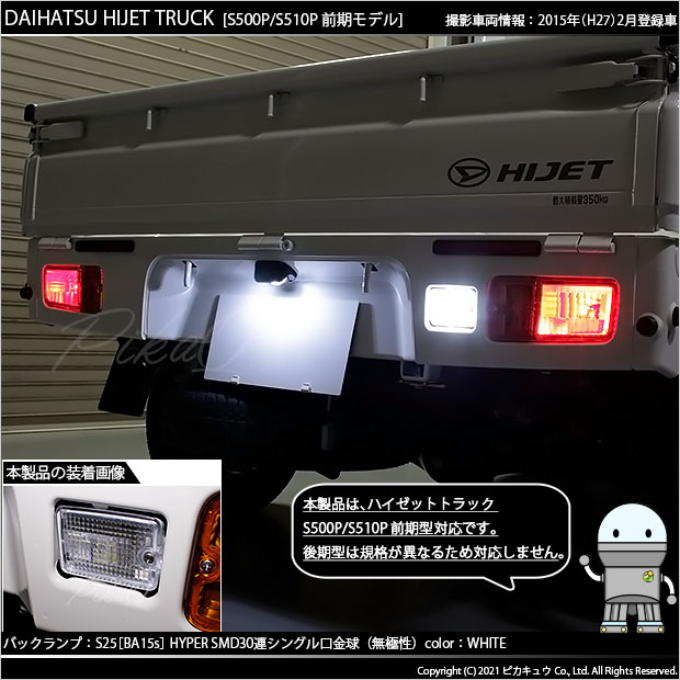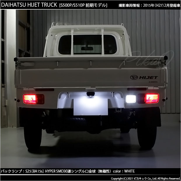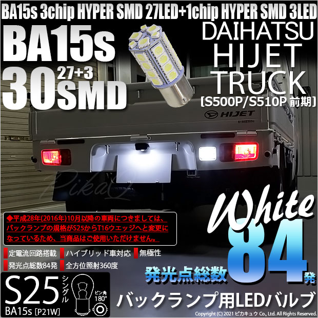 ピカキュウ,LED専門店,LEDバルブ,DC12V車,ハイブリッド車対応LEDバルブ,BA15s,P21W,S25シングル,ピン角180°,バックランプ,ホワイト,HYPER SMD30連シングル口金球,DAIHATSU,HIJET TRUCK,ダイハツ,ハイゼットトラック,ハイジェットトラック,S500P,S510P,前期