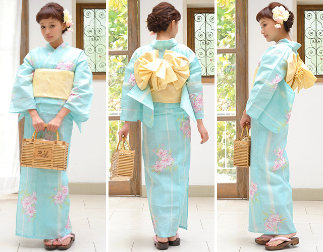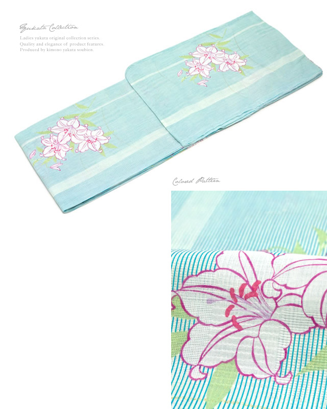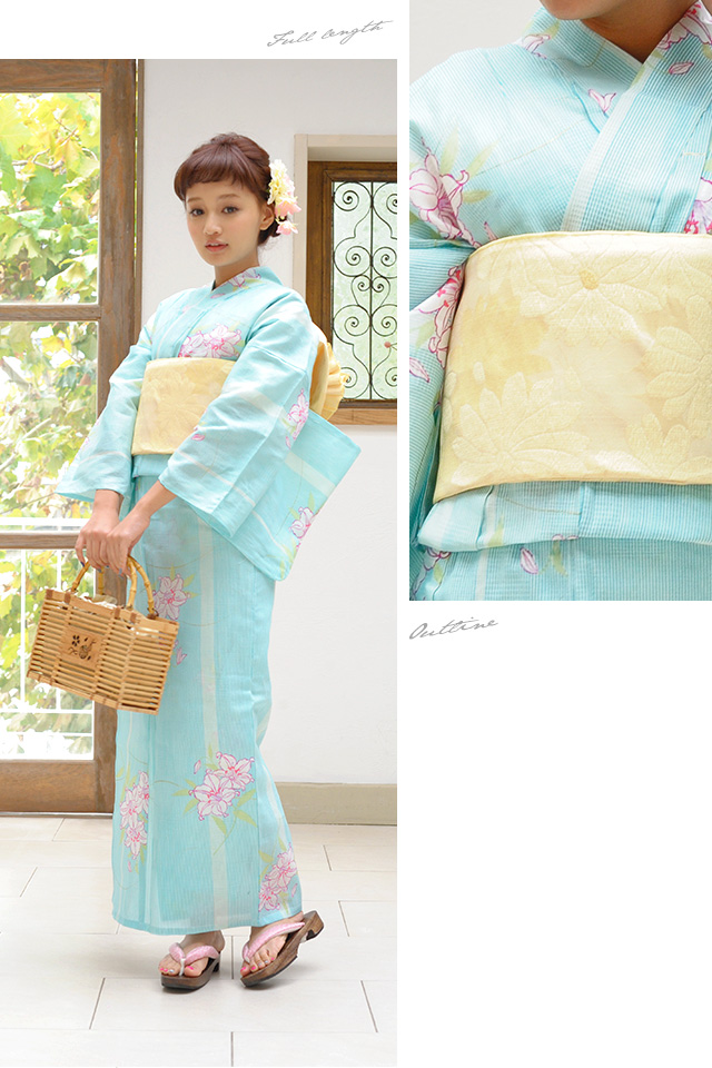 浴衣セット レディース レトロ 浴衣セット 大人 3点セット 水色 ブルー 黄色 百合 ユリ 花 縞 ストライプ 綿 兵児帯 女性 ボヌールセゾン