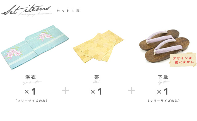 こちらの商品は、浴衣・帯・下駄の3点セットです。セット内容の一部変更や、それに伴う値引きは承っておりません。