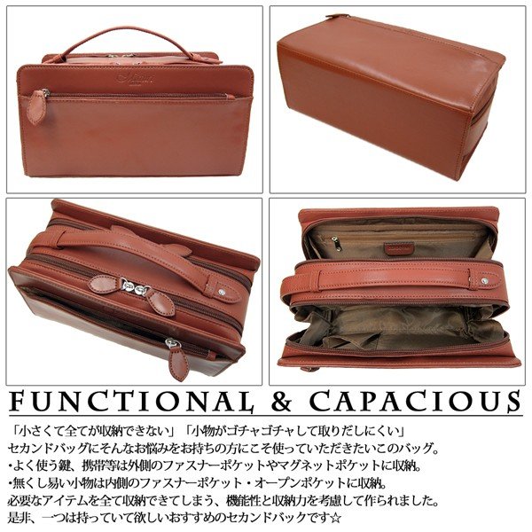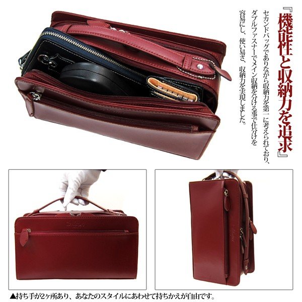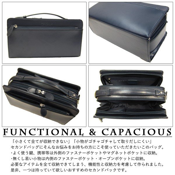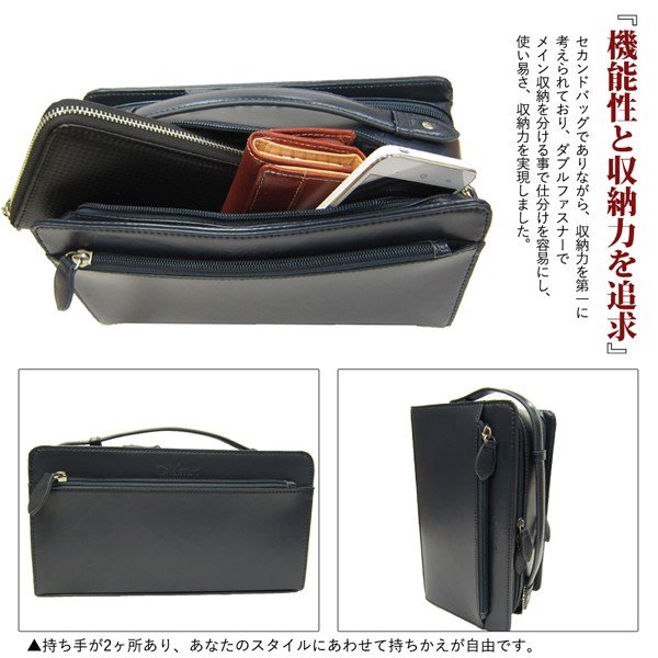 セカンドバッグでありながら収納力を第一に考えられており、ダブルファスナーでメイン収納を分ける事で仕分けを容易にし、使い易さ、収納力を実現しました。