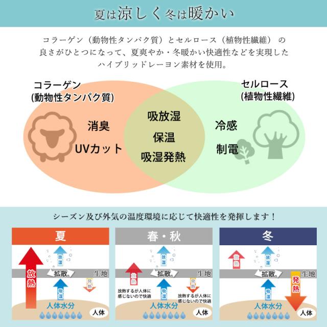 オールシーズンしっとりなめらか保湿…コラーゲン(動物性たんぱく質)とセルロース(植物由来繊維)の良さを1つに合わせたハイブリッドレーヨン素材を使用したインナーができました。