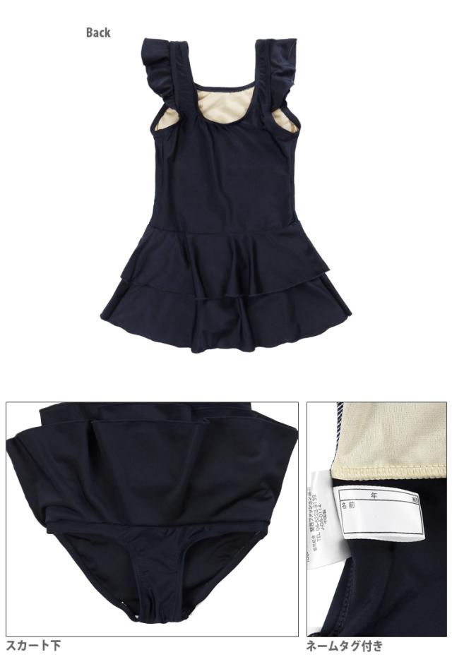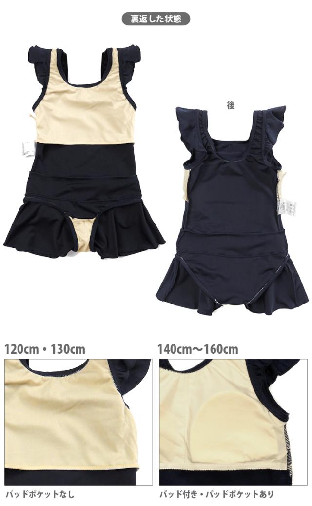 肩のフリルがかわいらしいガーリーなスクール水着。スカートも2段レイヤードでヒップを隠してれます。140cm〜160cmの水着には取り外し可能のパッドが付いているので、ジュニア女児にも安心のデザインです。