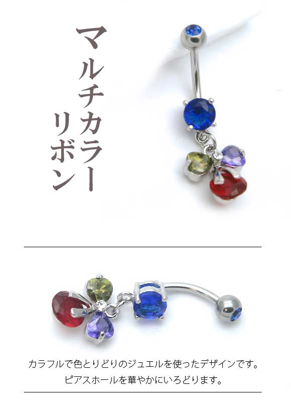マルチカラーが華やかなリボンジュエルが可愛いへそピアス。
