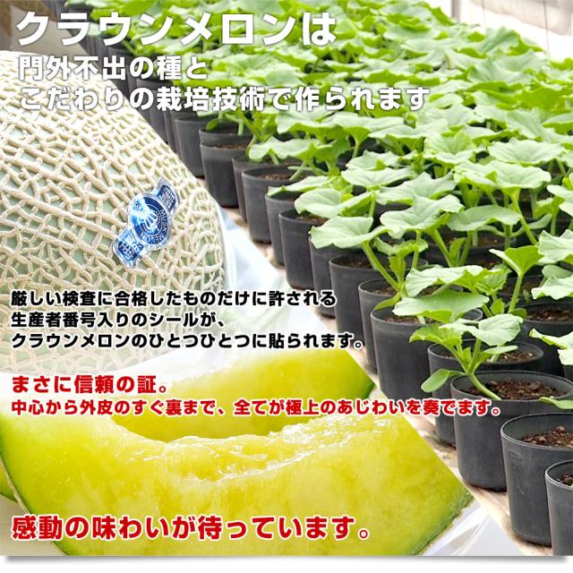 クラウンメロンは、門外不出の種とこだわりの栽培技術でつくられます。そして、厳しい検査に合格したものだけに許される生産者番号入りのシールが、クラウンメロンのひとつひとつに貼られます。まさに信頼の証。中心から外皮のすぐ裏まで、全てが極上のあじわいを奏でます。