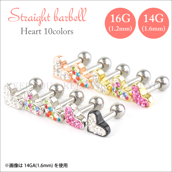 【メール便対応】ストレート バーベル ハート 03 16G(1.2mm) 14G(1.6mm) ジュエル ラインストーン サージカルステンレス316L 10色 ボディピアス デザイン モチーフ 軟骨ピアス ┃