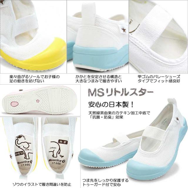 お子様の足の自然な形に近いラスト(足型)を採用した、ムーンスターの高機能上履き『MSリトルスター』です。つま先をゆったりに保ちながら甲周りをしっかり締める設計で、外反母趾や内反小趾を予防します。 通気性に優れたメッシュのアッパー素材は、速乾・丸洗いOK!「抗菌・防臭」効果のある天然緑茶由来のカテキン加工中底には、左右にゾウさんのイラストがまたがり、左右の履き間違いを防止します。チロリアンキャロット好きの方にもおススメ。安心、高品質の日本製。