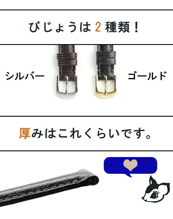 交換用ベルト 腕時計 カーフレザー バンビ 選べるモデル BE010 BAMBI 替えベルト レザーベルト かぶれの原因となりうる化学物質や染料を使わず、世界安全基準である「エコテックススタンダード100」の認証を受けている皮革を使用しています。独自の発想力、開発力、そして、日本の風土と文化が生んだ高度な技術を持つBAMBIのオリジナルスタンダードモデルのベルトです。多彩な機能とバリエーションを取り揃え、性別・年代を問わず使用していただけます。※サイズやカラー間違いにご注意くださいませ。 公式品番: BE010A BE010B カラー: ブラック チョコ かん幅: 10mm 11mm 12mm 13mm 14mm 15mm
