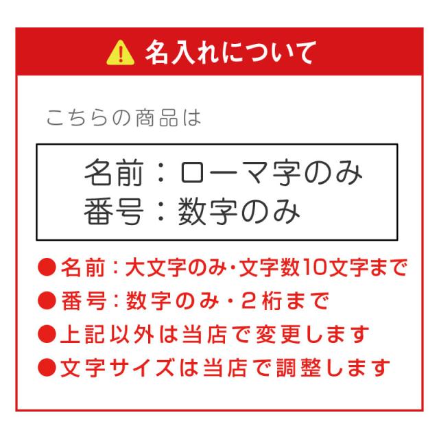 お名前:ローマ字のみ(大文字のみ) 数字:2桁まで 名入れ内容・ご要望は、買い物かごに商品を入れた後、「購入内容の確認」のページに表示される「記入欄」へご記入ください。※名入れの仕様は商品により異なります。名入れの仕様につきましては商品ページをご確認ください。※