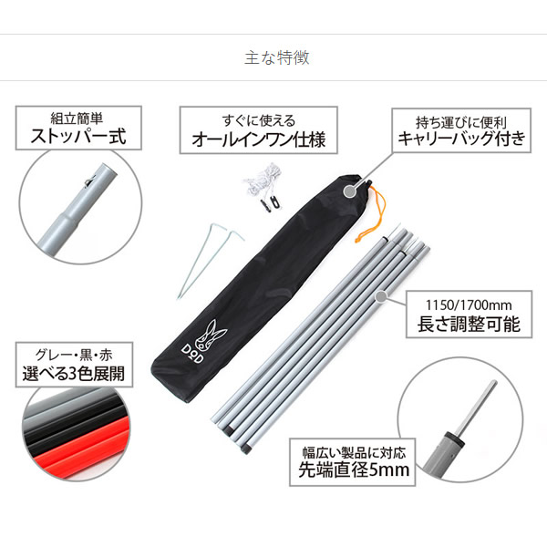 在庫あり テント タープポール キャノピーポール 2本 DOD 直径1.5cm 長さ115/170cm ロープ ペグ付 グレー XP-01 アウトドア キャンプ用品 テント タープ設営