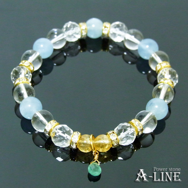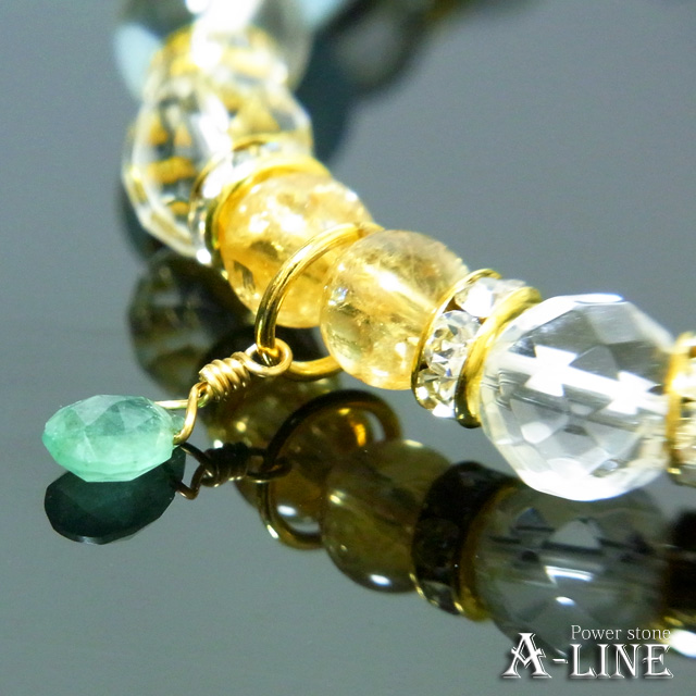 エメラルド(ワイヤー)・AAAアクアマリン8mm&64面カットクリスタル&水晶8mm・シトリン6mm・合金ロンデル・国産高級オペロンゴム
