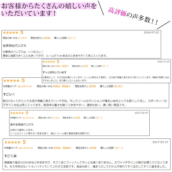 - 接客業ですが、店舗のスタッフ複数人がこれを履いてます。 7センチVカットですが、他の安価なものと比較にならないほど長持ちします。 最安値プレーンなパンプスの金額差だけでみると最安値ではないかもしれませ...