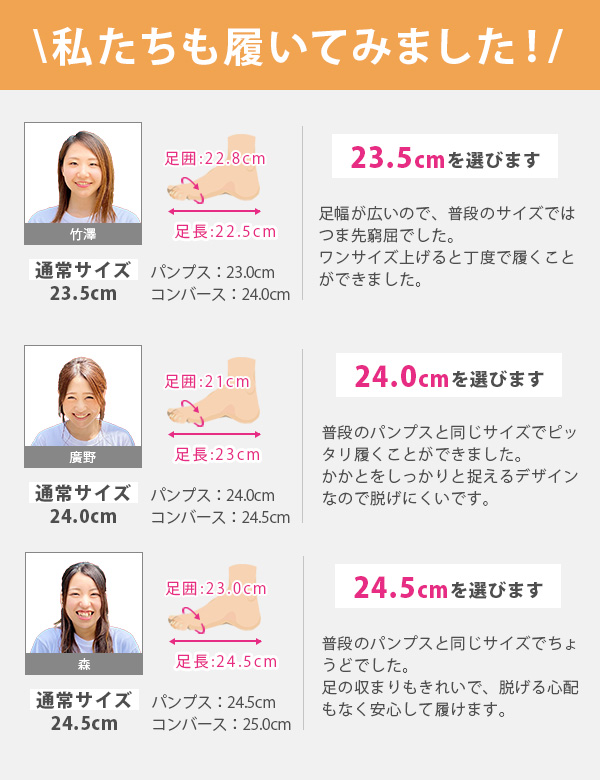 - サイズがいつも24cmなんですが、横幅が入らなかった為24.5cmに交換して頂きました。 とても早い対応をして頂きました。返品もスムーズで、分かりやすかったです。包装も綺麗で素敵でした。