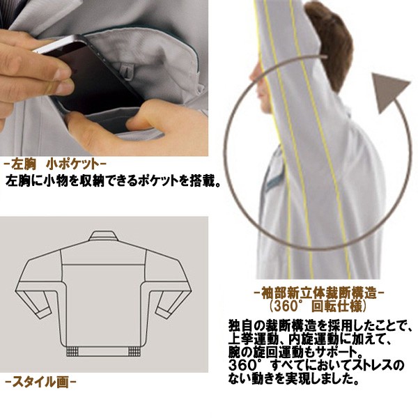 ●ポケット位置/左右胸ポケット(左胸ペン挿し付き)、左胸小ポケット、左右脇ポケット、左袖ペン挿し