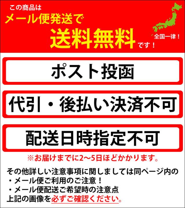 発送日より2〜5日程でポスト投函にてお届け予定。余裕をもってご注文頂きますようお願い申し上げます。メール便配送の為代引き決済 及び 後払い決済はご利用頂けません。