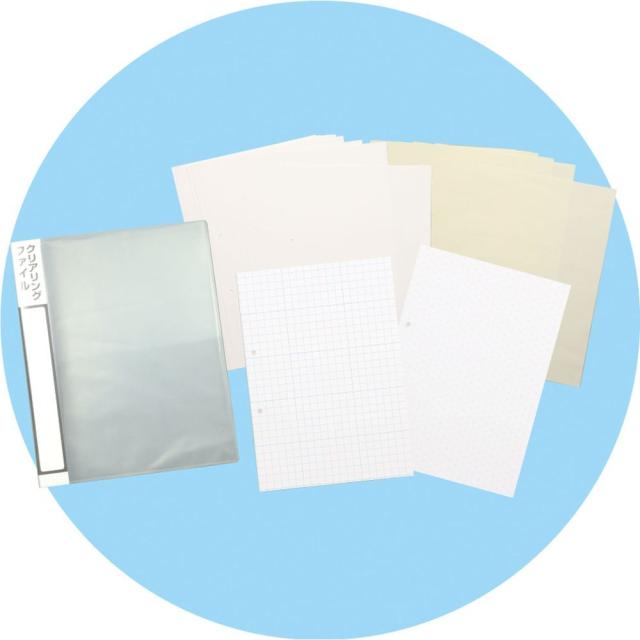 セット内容:画用紙 厚口×10、クロッキー用紙クリーム×10、クリアリングファイル×1、正方眼紙(5mm/10mm)両面×1、斜方眼紙(タテ/ヨコ)両面×1