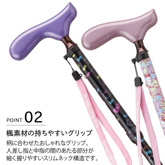 可愛いキティがプリントされたギフト人気No.1の折りたたみ杖。高さの調節もピッチ式(ボタン式)になっているのでご年配の方でも簡単に調節できます。