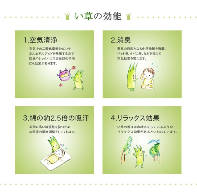 | 【枕】 側地=い草(九州産)※メセキ織 中材=低反発ウレタンチップ100% ヘリ=綿100% 【マット】 側地=い草 ※普通織 中材=固わた40mm ヘリ=綿100%(返し二方) |