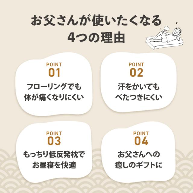 | ■ お父さんへのプレゼントとして毎年大好評の親父の場所シリーズのい草マットと枕のセットです。 ■ マットは、寝っころがってテレビを見たり、折りたたんで腰かけたり、リビングでのお昼寝用に、などいろいろな使い方ができるフリーマットです。 ■ 中材には固わた40mmを使用していますのでフローリングでも快適にご使用頂けます。 ■ まくらは、国産のい草を使用した、い草枕です。より頭にフィットするよう、枕の中心部分に「くぼみ」をつくりました。 ■ 中材には低反発ウレタンチップを使用しています。柔らかすぎずヘタリにくく、型崩れしにくいのが特長です。やわらかく心地良い眠りをサポートします。 ■ 快眠い草の効能として 1.綿の約2.5倍の吸湿力 2.蒸れにくい。汗による湿気を吸うことにより温度を下げ快適な就寝を促します。 3.汗のにおいを軽減。汗のにおいの元となる化学物質を90%以上抑えます。などがあります。 暑苦しい日本の夏でも汗のジメジメを軽減してくれます。 ■ 青森県のヒバの木から抽出した「ヒバエッセンス」をメーカー独自の技術で生地表面に加工しました。ヒバエッセンスにはヒノキチオールという天然物質が含まれており、抗菌防臭効果があります。 ■ なつかしい「い草」の香りに包まれた、落ち着きの場所をどうぞ。 |