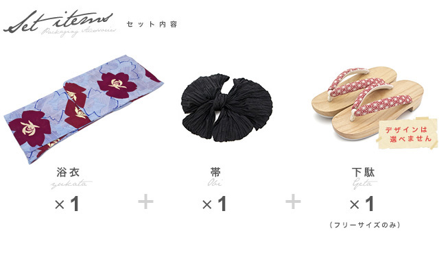 こちらの商品は、浴衣・帯・下駄の3点セットです。セット内容の一部変更や、それに伴う値引きは承っておりません。