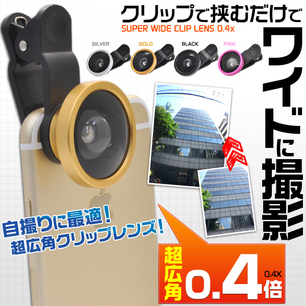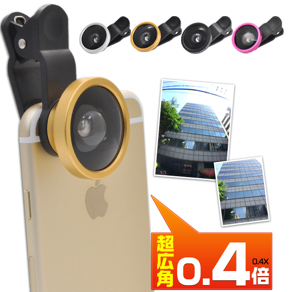 スマホクリップ式の0.4倍ワイドレンズ(広角レンズ)!通常の広角レンズよりさらに大きく、 広い範囲まで写す事が可能になるので、自撮りや記念撮影で大活躍します!