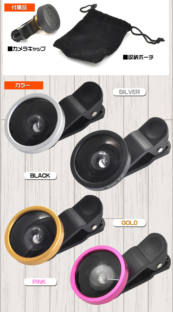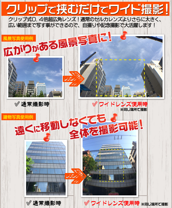 ※機器によっては、フラッシュ機能を利用できない場合があります。 ※ケースを装着したままですと、うまく挟むことが出来ない場合があります。 ※レンズを通して太陽など強い光を見ないでください。※ワイドレンズの特性により画像の歪みが生じる場合があります。※ケラレが発生しない設計ですが、スマホの撮影サイズの設定でケラレが生じる場合があります。その時は撮影サイズを変更してください。