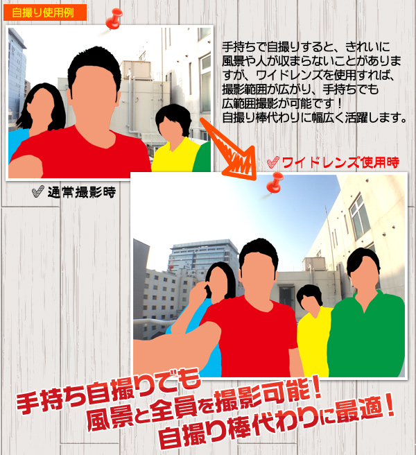 ■手持ちで自撮りすると、きれいに風景や人が収まらないことがありますが、ワイドレンズを使用すれば、 撮影範囲が広がり、手持ちでも広範囲撮影が可能です! 自撮り棒代わりに幅広く活躍します。