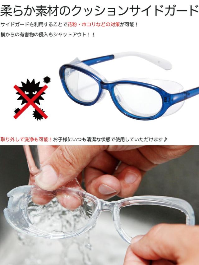 大切なお子様の目に優しく安全を一番に考えられて作られた、柔らか素材のクッションサイドガードを使用した子供用保護メガネ!お顔に優しくフィットして安心・安全。花粉・ホコリから衝突・転倒などの外部刺激からお子様の目を守ります。サイドガードは取り外して洗浄可能。花粉 黄砂 pm2.5 ドライアイ 花粉 花粉症 防塵 対策グッズ UVカット スポーツ 保護 メガネ 新型 肺炎 インフルエンザ ウイルス対策 空間 空気 除菌 抗菌 予防 マスク