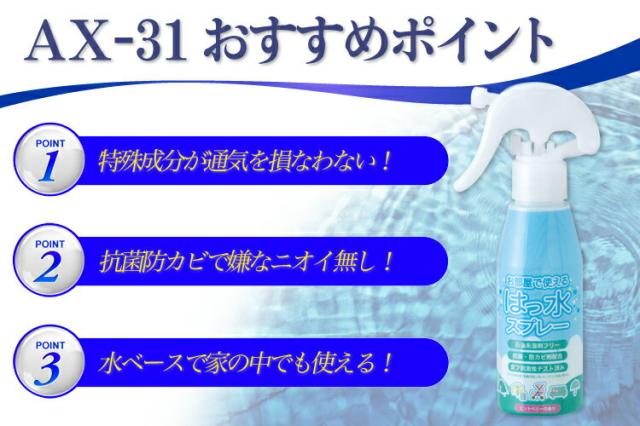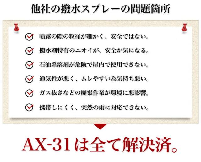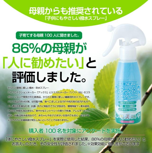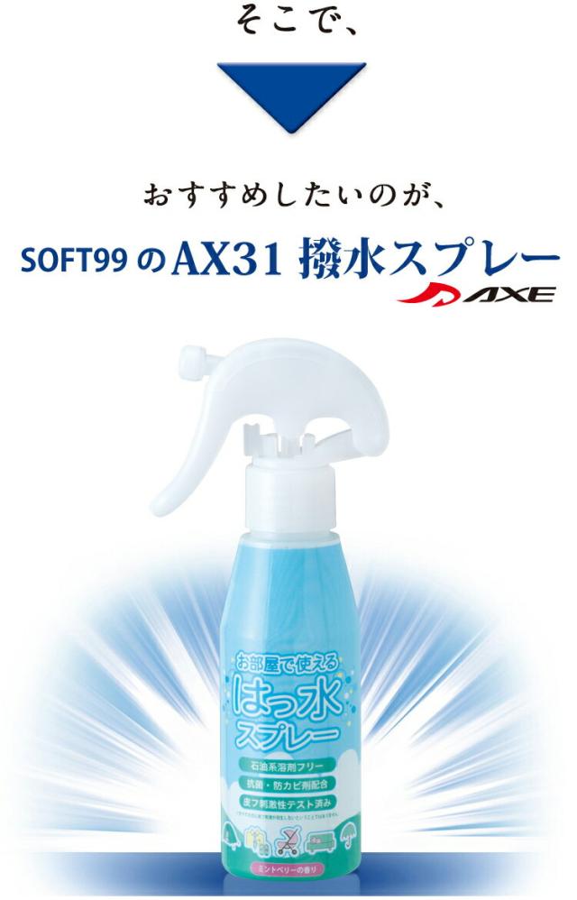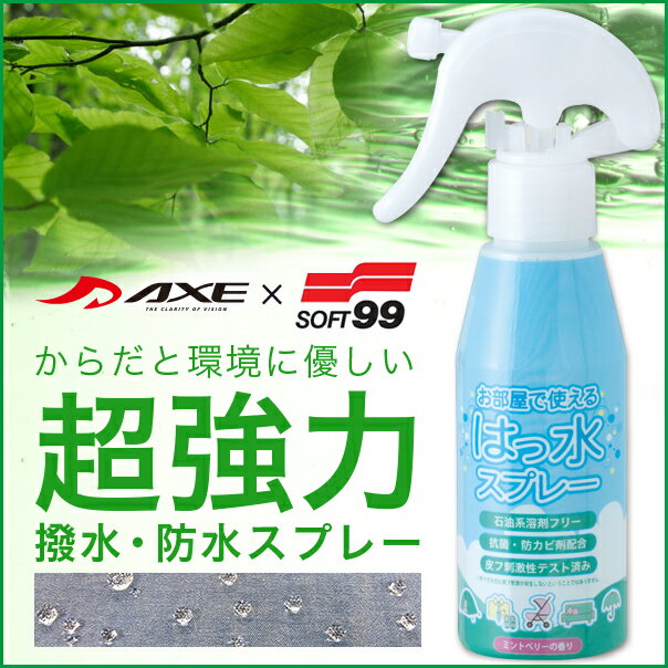 弱酸性で繊維 衣類のシミ汚れと水を弾く!廃棄簡単な超強力 持続 撥水スプレー 防水スプレー AXEのウォータープルーフプレミアム バイク 傘 レインウェア カッパ雨具の防カビ 防水加工に!アックス ソフト99 AX31 屋内対応 室内OK! スノーボードウェア ネクタイ スニーカー