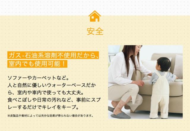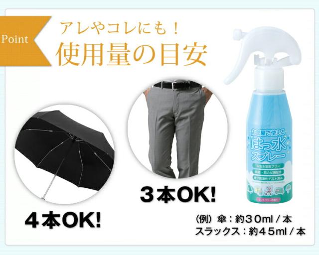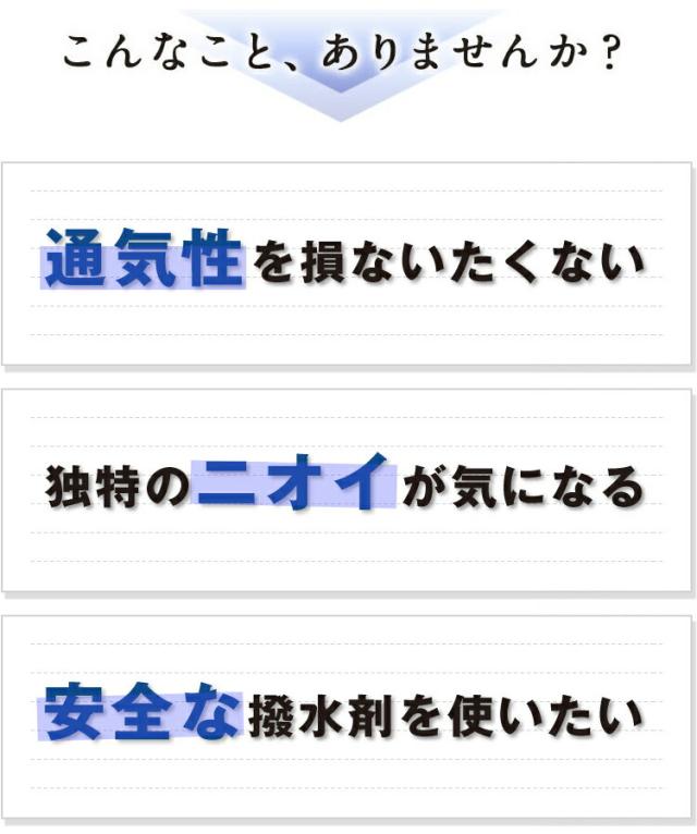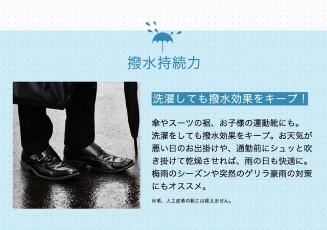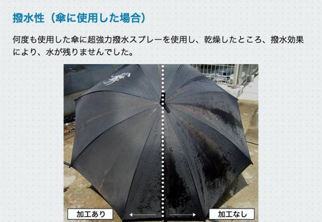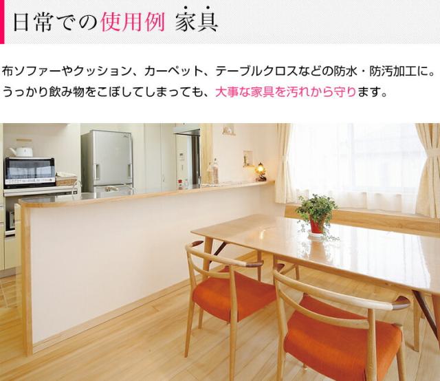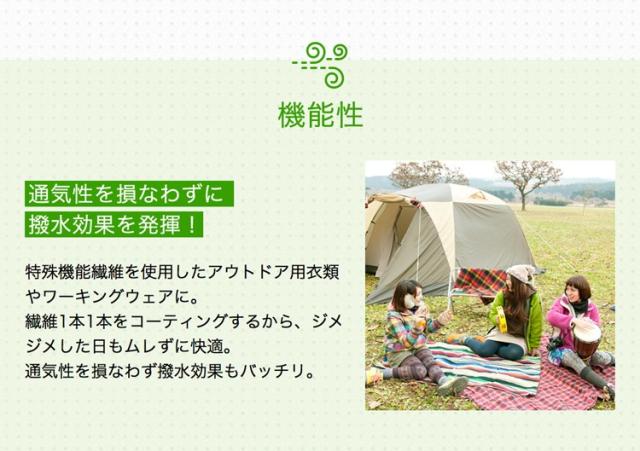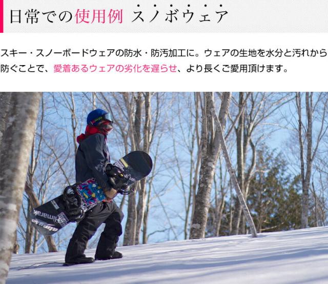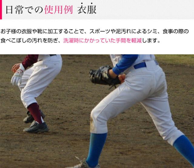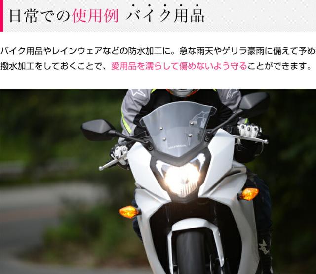 | 少量で広範囲使用できるので、低価格でしっかり防水加工ができます。 日常生活では傘のカビ防止や、バイクのレインウェア、スノーボードウェア等の防水加工、スポーツ衣服や靴の汚れ、子供の食べこぼしによる汚れの防止にもご使用いただけます。 |