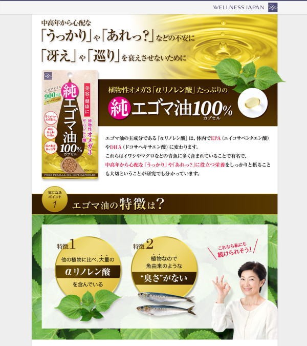 伝統的な圧搾法で絞った良質な天然ピュアオイルを続けやすいカプセルにしました。毎日のエゴマ油で健康生活をサポートします。酸化防止剤不使用。国内製造で安心です。【名称】エゴマ油含有加工食品【原材料名】エゴマ油、ゼラチン(ブタ由来)、グリセリン、(原材料の一部にゼラチンを含む。)【容量】90粒【お召し上がり方】栄養補助食品として1日3粒から6粒を目安に水またはぬるま湯と一緒にお召し上がりください。【保存方法】直射日光、高温多湿を避けて保存してください。【区分】健康食品【原産国】日本【メーカー】ウエルネスライフサイエンス