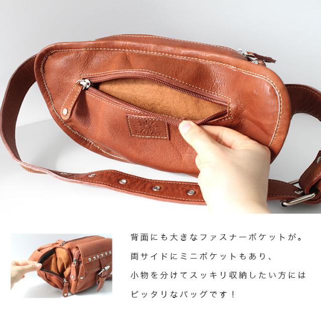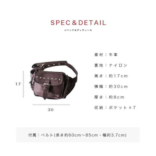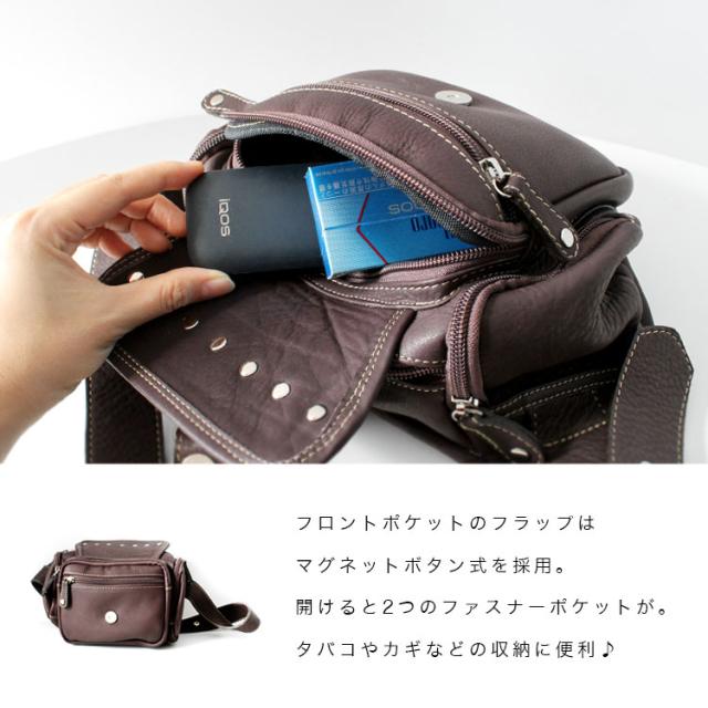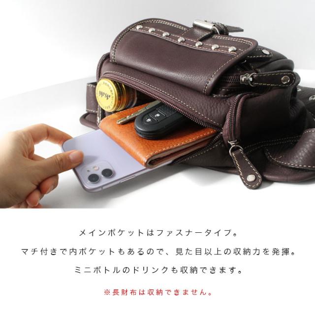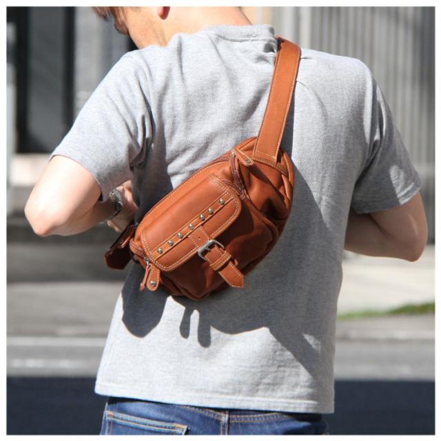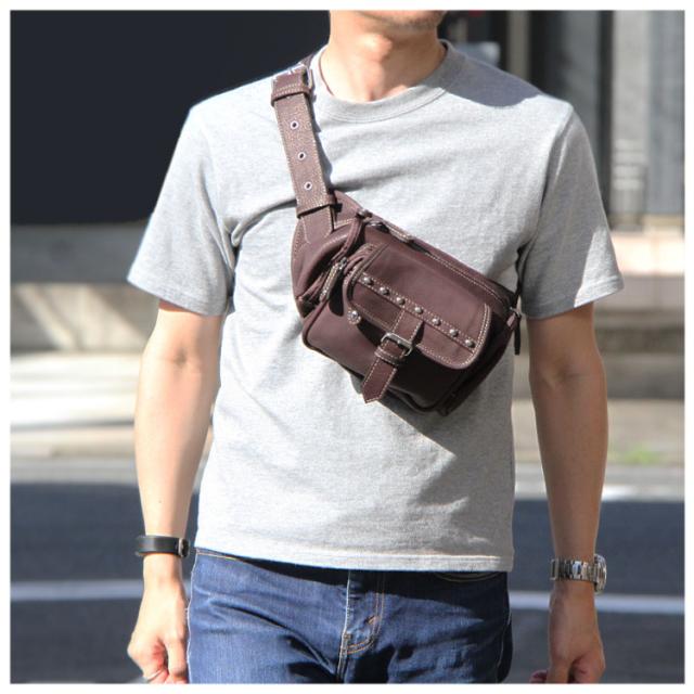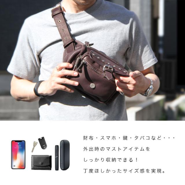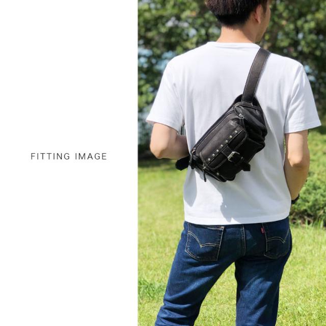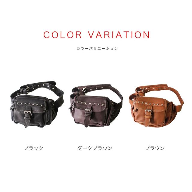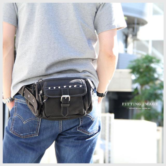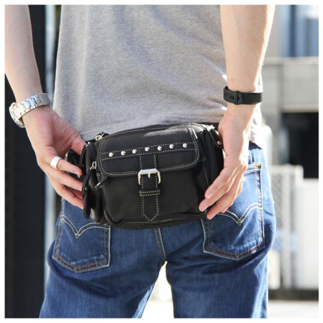 本革レザーバッグ スタッズライン カーフスキン ウエストポーチ マグネットボタンポケット ボディバッグ ウエストバッグ ブラック 牛革 メンズ レディース バイカー かばん 鞄 レザーバッグ 【ギフト】 lb117
