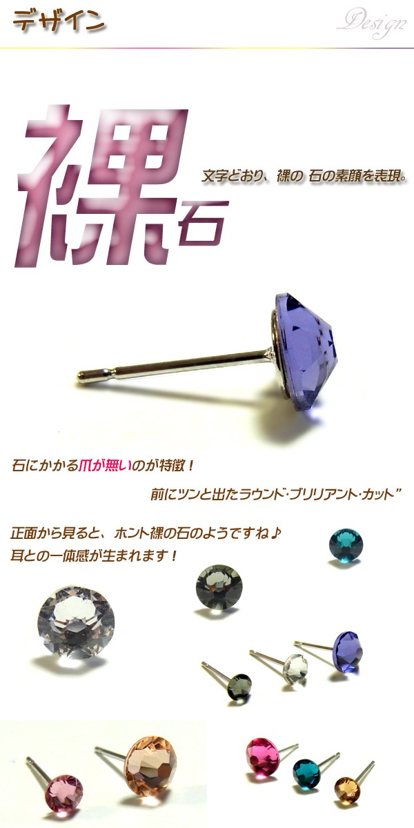 爪のない珍しい裸石はインパクトがあり、天然石のような輝きが楽しめます。石にかかる爪が無いのが特徴!前にツンと出たラウンド・ブリリアント・カット”正面から見ると、ホント裸の石のようですね♪ 耳との一体感が生まれます! 安心安全なステンレススチールライフをお楽しみください。