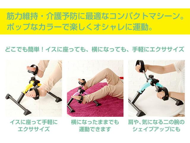 筋力維持・介護予防に最適なコンパクトマシーン。ポップなカラーで楽しくオシャレに運動できます。低負荷タイプですので、体力に自信のない方でも無理なく有酸素運動ができます。負荷の強さはダイヤルを回す事により調整できます。