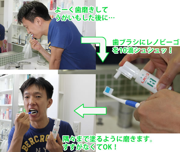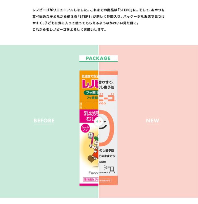 健康な歯の維持のために、歯科医師などによる「フッ素塗布法」や「フッ素洗口法」が実施されています。レノビーゴはご家庭で手軽におこなうことができるフッ素応用法です。研磨剤や粘結剤などがまったく配合されていない液体で、乳歯から使用できます。わずかなレモンの香りと甘味があります。 (甘味は生薬「甘草」の成分である「グリチルリチン酸ジカリウム」によるもので砂糖の甘味ではありません)
